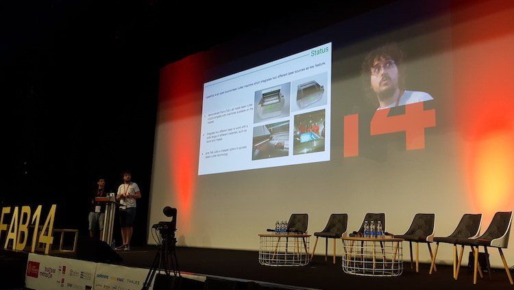 Fab14 workshop, showing the capabilities of Laser Duo, an open source dual laser cutter machine.